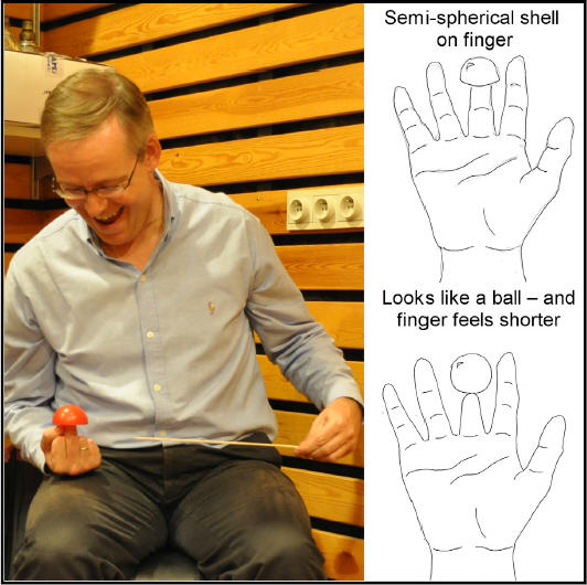 The Shrunken Finger IllusionThe set up is simple, and you should work along at home. Take one opaque, hemispherical plastic shell (say, half a ping pong ball) and balance it on the tip of your finger so that you cannot see that the ball is missing it's back half. Your line of sight should show you a sphere (see the figure from the paper below)