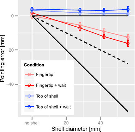 Now take a pointer (they used a 3mm knitting needle) and point to where 'it feels like the tip of your fingertip is'. People made errors as if their fingers were shorter, and the magnitude of the errors grew as the diameter of the sphere increased. The data (see Figure 2) suggest that people perceive that the hemisphere is actually a complete sphere, and they perceive that they are touching the far outside of a complete sphere, not the near inside of the incomplete sphere.Figure 2. Data from the main experiment. The solid horizontal line at 0 is where the fingertip actually is; the solid diagonal line is where the bottom of the sphere would be if the ball was complete; the dashed diagonal line is where the bottom of a complete hemisphere would be if it were there