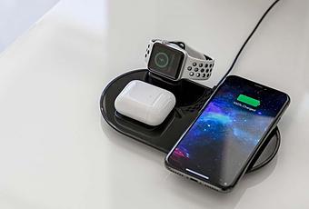 This Mophie wireless charger includes two Qi surfaces with coils capable of charging up to 7.5w. The charger also features a USB-A port on its rear that allows users to plug into an additional device like an Apple Watch or other wearables.