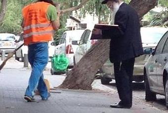 This week, one Tel Aviv morning in a neighborhood not "suspected" of having too many religious people, to put it lightly, a street cleaner, not religious, walked with one handing holding his broom and the other hand dragging his garbage wagon. Step after step, another blown wrapper, another wrinkled tissue passed into the green can on the cart.
