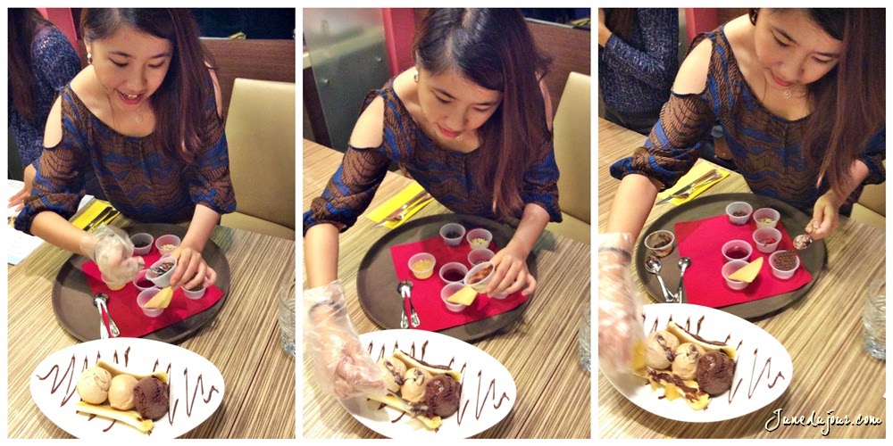 We got to DIY our very own banana split and let me just tell you; it isn't as easy as it looks. Starting off with 3 gelato scoops of our choice (Gula Melaka, Peanut Butter caramel and dark chococlate), I first drizzled (or tried hard to, the paste was too sticky) the chocolate paste. Next, generous sprinkles of chocolate flakes and pineapple chunks on the side.
