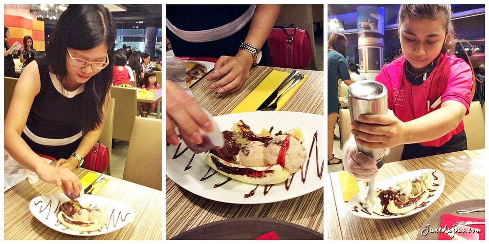 And behold, our 'masterpiece' which we lovingly dubbed as Lady Gaga 2.0 (because during the make I kept calling it our little monstrosity. Kudos to the dessert makers who dish out such great looking banana-splits. after trying it on our own I know now not to underestimate the skill behind it.