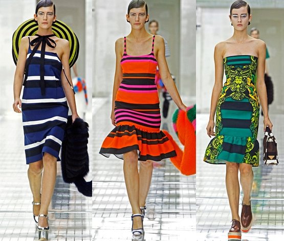 Season after season Miuccia sends inventive and beautiful collections down the runway and her influence is everywhere right now. Simply take a walk through your local shopping mall and you will be overwhelmed with stripes, color blocking, impossibly high stacked wedges, hot pink clutches, and color combinations like blue and green and pink and orange, pink and navy (which I adore by the way). Her Spring Summer 2011 collection is blazing a trail through chain stores, magazines, on the mannequins in store windows, cushion covers and accessories.