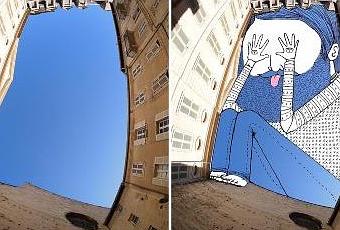 In his series SkyArt, Thomas uses these shapes and transforms them into a canvas for clever line drawings of curious cats, voluptuous ladies, elderly men, a rooster playing the banjo. A clever form of upcycling dead space into something more.