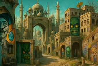 Faint hums come from the ventilation ducts along the walls. The sound of distant chanting echoes from within the palace complex. Occasionally, a small orb-shaped drone floats down the alley, scanning graffiti for encoded messages left by underground sages or wandering mystics.