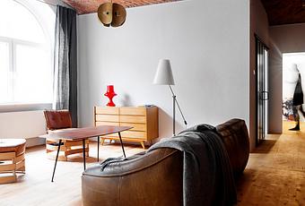 By burnishing historic details and adjusting the floor plan, multidisciplinary studio Loft Szczecin restored and transformed a loft in a warehouse that dates from before World War II. The living room rug is a Polish textile from the 1930s.