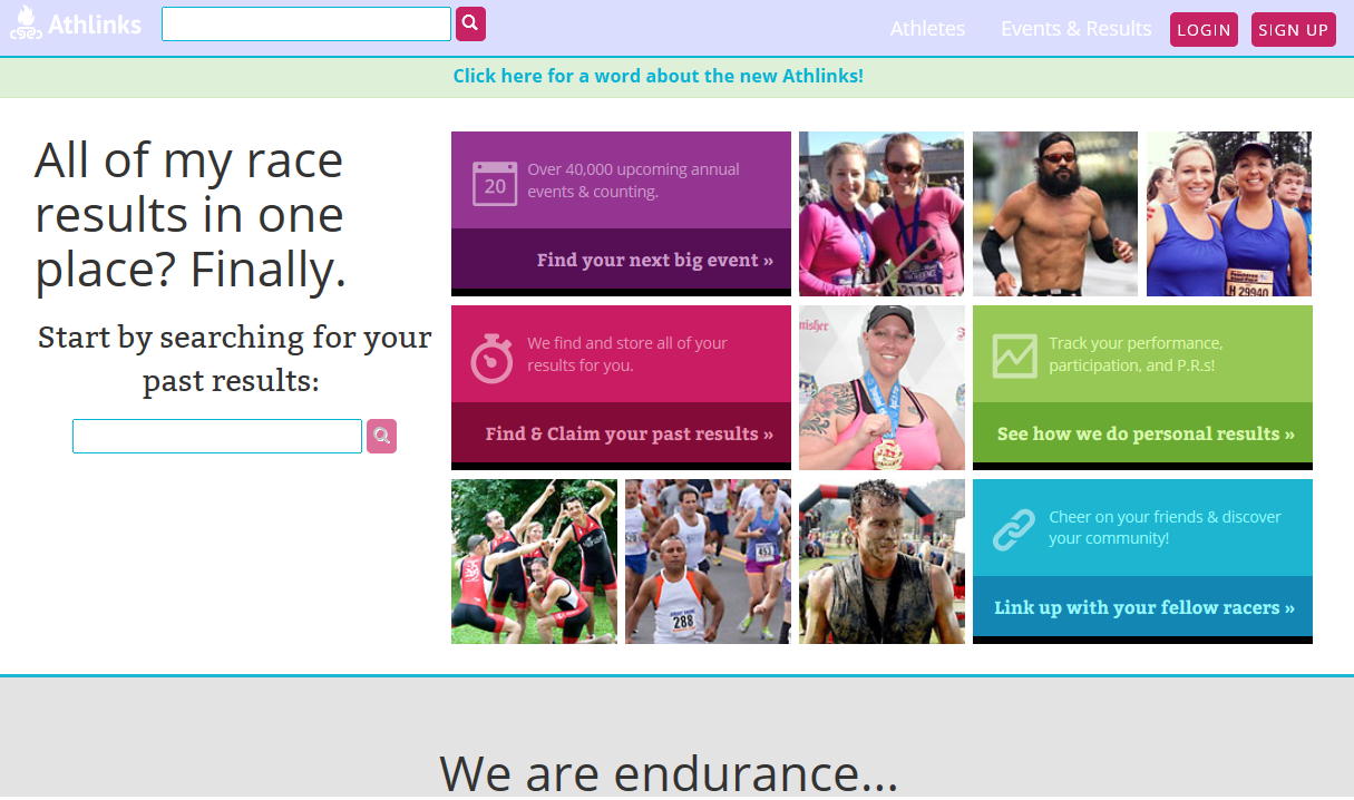 I've played around with a few other neat features. You can search for and find upcoming events and add them to your profile. You can add your running friends through the Links tab. You can send and receive Cheers for your results. There are options to share through Twitter and Facebook. Plus there are dozens of other features I have yet to discover. Check it out when you get a chance. Especially if you have been running more than a year or two, you'll be surprised to find old results on there. Feel free to add us to your links: DG https://www.athlinks.com/athletes/173081617/profile