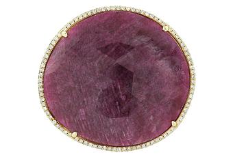 Our slice rings are back! And bigger than ever. If this 26.63 carat ruby ring isn’t a cause for celebration, we don’t know what is. So we’re mixing up a fabulous concoction worthy of this deep, glossy precious stone (and it’s beautiful 18kt yellow gold and .25ctw of diamond pave). This POM fleur cocktail packs a nice punch of antioxidants along with some St. Germain and vodka, courtesy of Sugar Loco.com. Its lovely ruby hue nicely matches that of the cocktail on your hand. Of course, the cocktail in your hand is only as decadent as you make it, and the ruby ring is really a non-negotiable. Cheers!