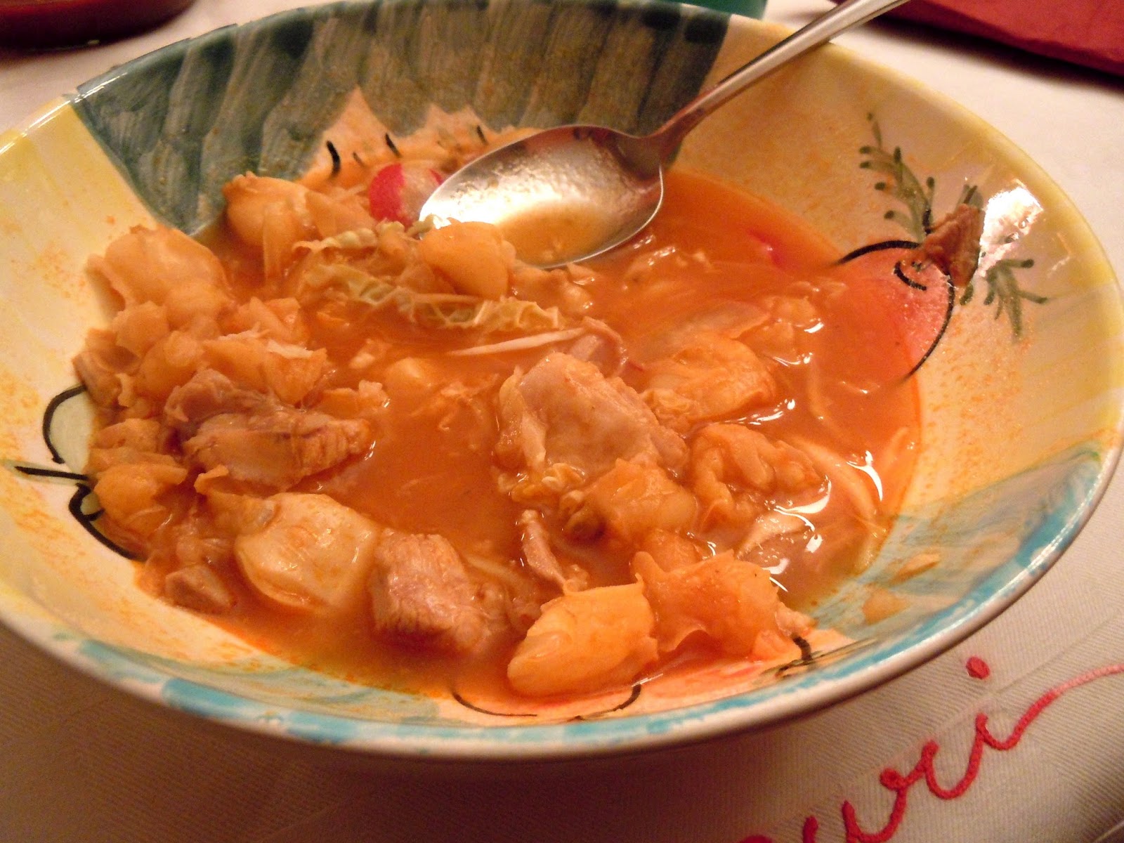 Saturday 9pm: shared a bowl of posole (pre-Columbian stew with hominy, pork, chili peppers, cabbage, and hot sauce) with my mom.