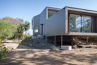 Located in the beachside town of Somers in Australia, this 600-square-foot home by Open Studio stands out from the single-story crowd by hovering over the landscape. Imagined as something more permanent than just a weekend escape, it allows for flexible programming with an open-floor plan and room for guests on the lower level. The structure is designed to disrupt the surrounding landscape as little as possible. From locally sourced timber cladding to a rainwater infiltration system, the final design harmonizes with the natural elements.