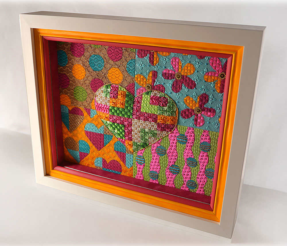 I've been so excited to see last summer's Mystery Class project Garden Party Heart coming back from the finishers, this one in an amazing shadow box frame that really sets off the 3D effect on the center heart. Thanks so much to Sue and Ruth for sharing!