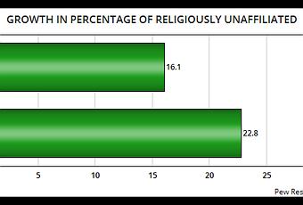 The Pew Research Center has released its yearly report on religion in the United States. That report shows that organized religion is still declining. In just the last seven years, the percentage of those unaffiliated with any organized religion has grown from 16.1% to 22.8% of the population -- and the number of unaffiliateds has grown from 36.6 million people to 55.8 million. That makes the "nones" the largest group in this country -- larger than any single religious group.