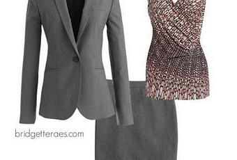 Take this grey J. Crew skirt suit ( jacket link, here, skirt link, here). It's just as versatile as a black suit and any color can be worn with it. You can take a similar approach with this suit as I explained in the two previous looks. However, the next suggestion that I want to make, particularly if color combining isn't your strength, is to look to the prints in your wardrobe, be them in your scarves and tops, and see them like little road maps on color combining. Using this top from Nic + Zoe, I used the peach and the taupe shades found in the print to give this very basic suit a fresh look. As luck would have it, I stumbled on these taupe and peach spectator pumps from Tahari that work perfectly. However, a pair of taupe or peach pumps would certainly work just fine. Finishing the look, I pulled the peach from the top and added this statement necklace from Nordstrom.