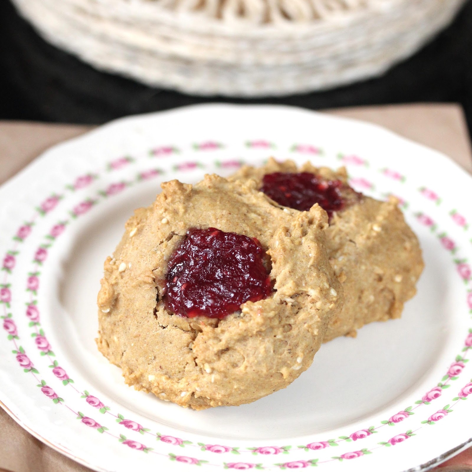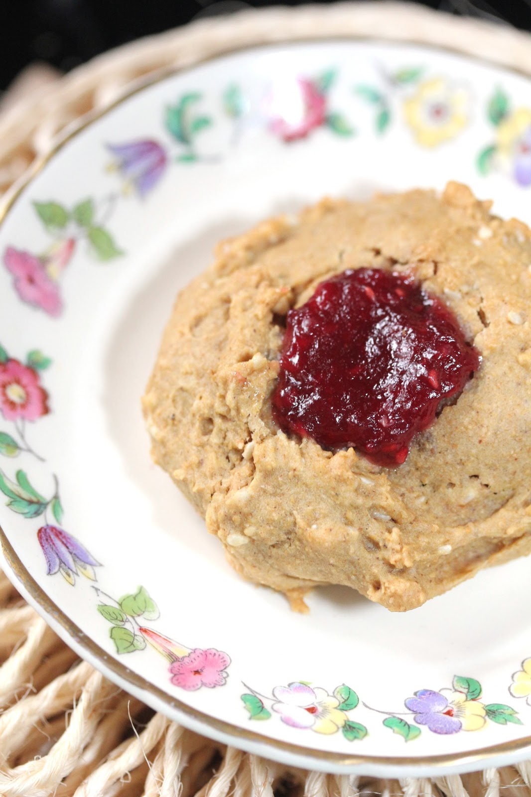Ingredients 1 cup whole-wheat flour 1 tsp baking soda 2 tbsp peanut butter 2 tbsp Maple Syrup ½ cup non dairy milk (I used almond milk) 2 tsp vanilla 2 tbsp sesame seeds 2 tbsp shredded unsweetened coconut (I omitted this) 1.5 tbsp of your favorite vegan Jam (I used raspberry) Method 1. Preheat the oven to 200 degrees celcius/ 392 degrees fahrenheit 2. Mix the peanut butter, maple syrup and vanilla together to form a smooth paste 3. Add the flour, baking soda, sesame seeds and stir together 4. The dough will be really stiff, so add a little of the milk until it comes together into a pliable dough 5. In a baking tray lines with baking parchment, form the dough into 8 balls and press down in the center with your thumb to make an indentation 6. Bake in the oven for between 7 and 12 minutes (keep checking, the cookies should be lovely and golden 7. Remove from the oven and let cool 8. Using a teaspoon pop a little blob of jam in the indentations to fill them Enjoy!