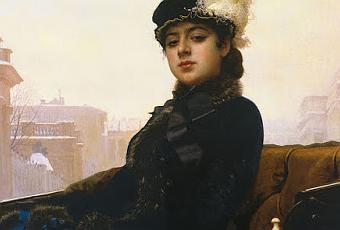Look at the blue on the edges of her muff (those that thought 'it must be the cold' can see me after class), isn't it heavenly? The canvas is a harmony of brown and cream, from the velvet (or leather) of the seat, through to the foamy off-white of the feather on her hat, echoing the snow trim on the buildings around her. That blue just jumps at you, deep and rich as the night sky, but as unexpected as a kiss on a cold day. It's uncertain whether or not Kramskoy meant this to be an actual portrait, as he created a few images that are a mixture of portraiture and genre, the viewer left to deduce the character of the subject from the evidence left by the artist. This is a young woman, beautiful and haughty who is literally looking down on us. Are we not good enough for her, or has she slowed her sleigh to see us despite the difference in our status?
