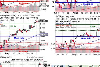 The Dollar is pushing up half a point this morning, to 79.65 and that's roughing up the Futures at the moment. After a 10% drop in oil for the week, we were satisfied to take the money and run yesterday and congratulations to all who played along. Our first short play (mentioned in Monday morning's post) was the DUG weekly $19 calls at .30 last Friday (where they opened Monday as well) and they closed out at .95 yesterday with DUG testing $20 – up 233% for the week. We also closed the SCO October $37 calls at $5 – those were in the virtual $25,000 Portfolio (featured Friday) and 10 of those calls purchased for $3,730 on Aug 9th and September 12th sold for $5,000 on September 19th for a $1,270 profit – a 34% gain in a month is not bad…