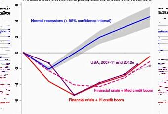 Recessions due to financial crises are generally preceded by a financial bubble where some asset, such as real estate, increases dramatically in price and then people, companies and banks take on more and more debt to try to make money by speculating on this asset. This is what happened in the run up to the Great Recession and the Japanese financial crisis in the 1990′s. When the bubble finally bursts, people are left with lots of debt and little money to spend, thereby inducing a recession. In the case of real estate, the debt is in the form of mortgages, which are usually long term. The time constant will be the average duration of the mortgage or the time it takes to refinance. In both cases, this will take longer than two years. Thus, the recession will persist until people can pay off or unload their debts and both are difficult when the economy is depressed. It also shows why monetary policy may have little effect. Lowering interest rates can’t directly help the people trapped in long-term mortgages. However, if the interest rates can be kept low enough and long enough to induce some inflation then house prices increase while effective debt decreases so people can sell their homes or refinance and get more money to spend. This is basically what current Fed chairman Ben Bernanke is trying to do. Another option would be for the federal government to take advantage of low interest rates and start buying property. They could have started a buy-and-lease program where underwater homeowners could sell their homes to the government and then rent it back from them. This would keep people in their homes, bolster the economy and also ensure that people who made bad decisions during the bubble do not profit from their mistakes. When house prices rise again, the government would pocket the profits.