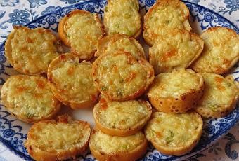 Grated cheese, mayonnaise and chopped spring onions. The original recipe called for twice as much mayonnaise, but I have cut it way back and they work fine with half the amount. I would not use low fat mayo. You just mix together all the ingredients and then spread the mixture onto French bread rounds and bake. Easy Peasy!