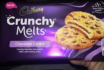 Cadbury are back with another product, and this time they're getting in on the filled cookie market. Here we have Crunchy Melts, cookies with a melty center. "Even better warm!" the packaging screams. Yeah, I'll take that action. See, you can enjoy these as is, or you can blitz them for ten seconds at a time, and enjoy that hot gooey goodness. Not more than ten seconds though, because then you'll burn the roof of your mouth and ruin your day.