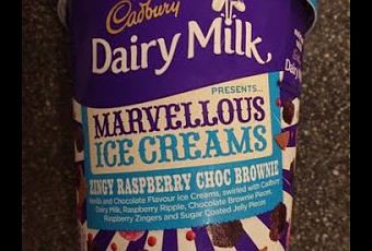 Cadbury have certainly churned out some nice bars in their Marvellous Creations range, and now they've brought out some interesting ice creams to complement them. There are a few to choose from, but my attention was drawn to this awesome sounding variety. It boasts vanilla and chocolate ice creams, swirled in with Dairy Milk pieces, raspberry ripple, chocolate brownie pieces, raspberry zingers and sugar coated jelly pieces.