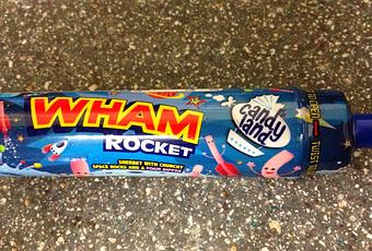 This neat little package contains the same awesome raspberry sherbet as found in the Refreshers Dip Dab. It's smooth, tingly, and delicious. What's more, there are tiny crunchy fruit pieces mixed in, which add a nice difference in texture throughout. The dipper is interesting too. It's not a lolly, it's not liquorice, instead it's a pink foamy spoon thing, which is apparently raspberry flavoured, but tasted more like a foam shrimp sweet to me. Still, it's certainly good for scooping up the stuff inside, but it was so nice I just ended up eating it first and tipping the sherbet straight into my face. If you ask me, anything that you eat in a way that makes you disgusted with yourself after has to be good, and the Wham Rocket certainly is delicious.