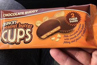 Here's another treat I picked up from the world foods section at Sainsbury's, some peanut butter cups that aren't Reese's, and for only 50p a pack! I wasn't expecting much from these, but they promised some praline in the chocolate, so I was interested to see how that worked out. Turns out it's a pretty sweet peanut butter cup. The chocolate is thick, with a creamy, sweet praline flavor. I'd say it's actually better than the chocolate in a Reese's cup, but unfortunately the peanut butter isn't quite up to scratch. It's nice enough, a bit crunchy and salty, but it's not the best I've had. It all evens out to a fair contender to the Reese's throne, and they're worth trying out if you want something a little different in your peanut butter cup.
