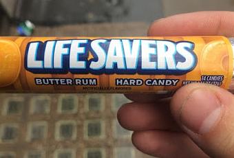 Another acquisition from my candy store trip last week, these are butter rum Lifesavers. Now, I'm partial to a Lifesaver, they're a pretty good American version of Polos, and they come in fruity flavours as well as mint, which is great. But butter rum? That's an interesting combination if I ever heard of one.