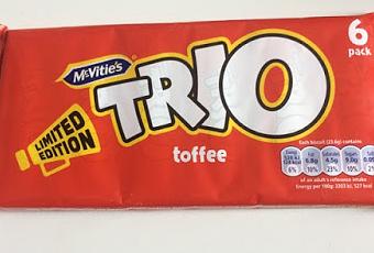 Trio bars haven't been around for a while, or so the internet is telling me. I probably ate some when they were out 13 years ago, but I didn't have my review cap on then so I probably didn't notice it. That doesn't bode particularly well, as I always missed Nerds and Wispas when they went away, but maybe I just wasn't as immersed in Trio madness as others. But anyway, they're back, and I picked some up. I assumed they're called Trio because there are three elements: Biscuit, toffee cream and chocolate. Or maybe they're called Trio because the bar is split into three sections. Or maybe both.