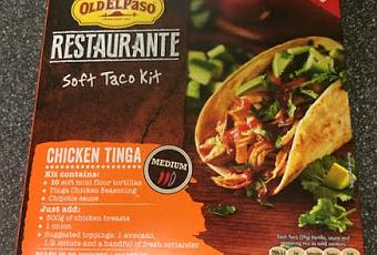Old El Paso is a favorite in our household, quick and easy Mexican meals that don't require me to invest in a spice rack. We normally go for the chicken fajitas and enchiladas, but this fancy looking new variety caught my eye recently. These are Chicken Tinga soft tacos, and Chicken Tinga doesn't quite sound fancy enough to be served in a "Restaurante", but hey, the picture certainly looks tasty.