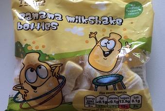 There is a distinct lack of proper milk bottle sweets in some supermarkets. You know the ones, the chewy, powder covered bottles. I normally have to settle for the plain old gummy ones, which are alright, but they don't quite fit the spot. Well, Tesco now have filled the void by bringing out these powdered bottles, yay! Only thing is, they're banana flavoured.