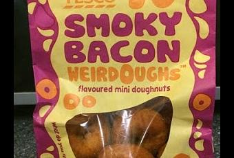 A few months back Tesco introduced Weirdoughs, crisp flavoured doughnuts that sound positively disgusting, but are actually pretty awesome. I can't say I've added them to my list of staple foods, but I definitely had to pick up a bag when I spotted the new smoky bacon flavor on the shelf today. Bacon crisp flavoured doughnuts, sounds like an almighty American mess of a concoction. But I was surprised before, so I had high hopes for these.
