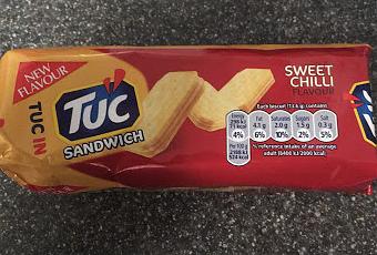 I reviewed the new sweet chilli Tuc last month, but apparently I missed this packet when I picked up the first. It's a sweet chilli Tuc Sandwich, which are like Tuc but better, because there's some nice cheesy stuff sandwiched between them.
