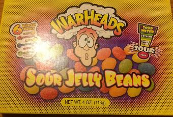 I reviewed the Warheads Chewy Cubes the other day, and was less than impressed. But I also picked up these sour jelly beans at the same time, and they're one step up on the sour meter, so hopefully they would fare better with me. These come in six flavours, like the cubes, but some are slightly different. There's just plain old cherry instead of black cherry, and the strawberry has been swapped out for lemon.