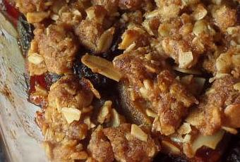 For the topping:4 TBS butter4 1/2 TBS soft light muscovado sugar9 TBS plain flour9 TBS rolled oats2 TBS flaked almondspinch salt