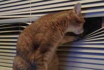 From seeing all these cats peeking through blinds I have learnt one thing. Peeking out looks funny, but peeking in looks kind of weird, in an Alfred Hitchcock kind of way.