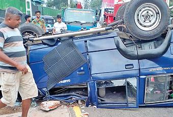 A Police jeep toppled when it lost control due to the hand brakes ceasing to function on the Colombo-Kandy road while parked on a hill in Weweldeniya. The vehicle belongs to Danowita police. Several police officers had been present at the time of the incident on Saturday. However, nobody was injured. (Picture by Kotadeniyawa group corr M. P. Kumara)