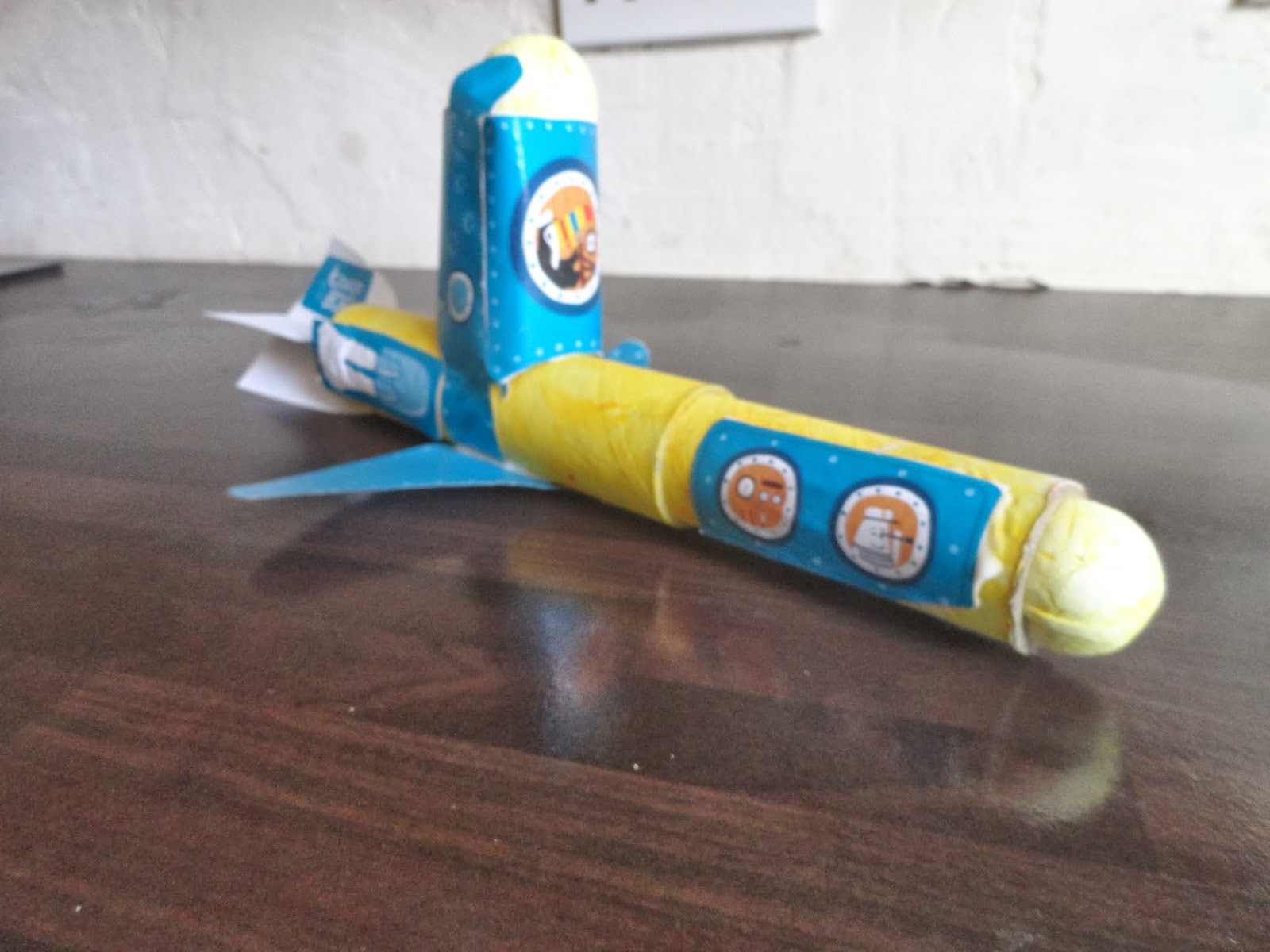 Yellow submarine - Jacob painted to tubes and two balls yellow, and once dry he put the two tubes together, and the smaller ball on one end. We then cut out the template given by Toucan, and glued it to the tubs, and finally stuck the second ball in the top.