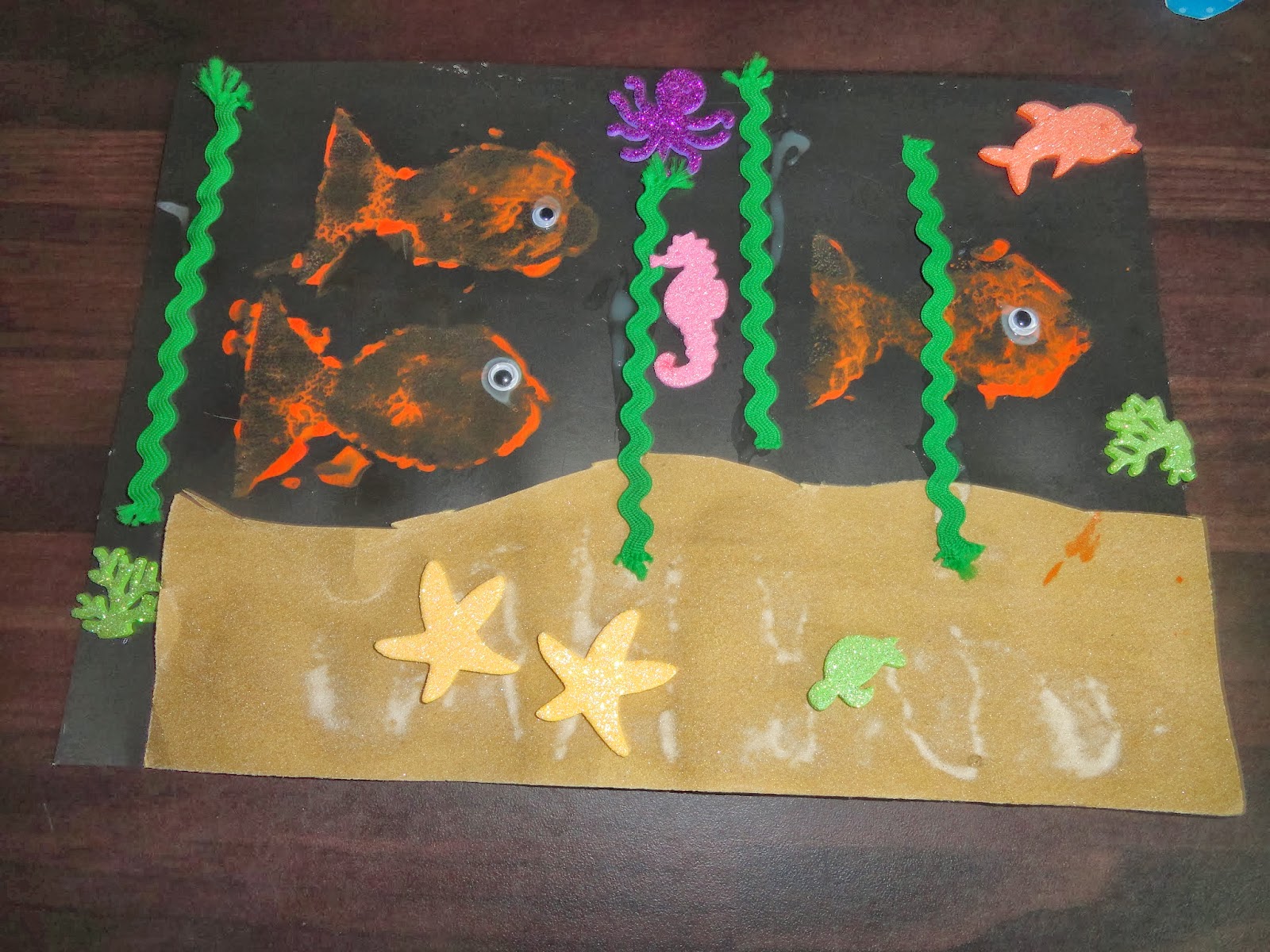 Finally the picture, Jacob first cut out the sandpaper and clued it on the black paper, he then clued the green ribbon on the picture to make the seaweed, and we cut out a fish shape on the sponge which was also supplied. Jacob then made some fishy paint prints, and he stuck an eye on each fish and finally included were the stickers of sea creatures.