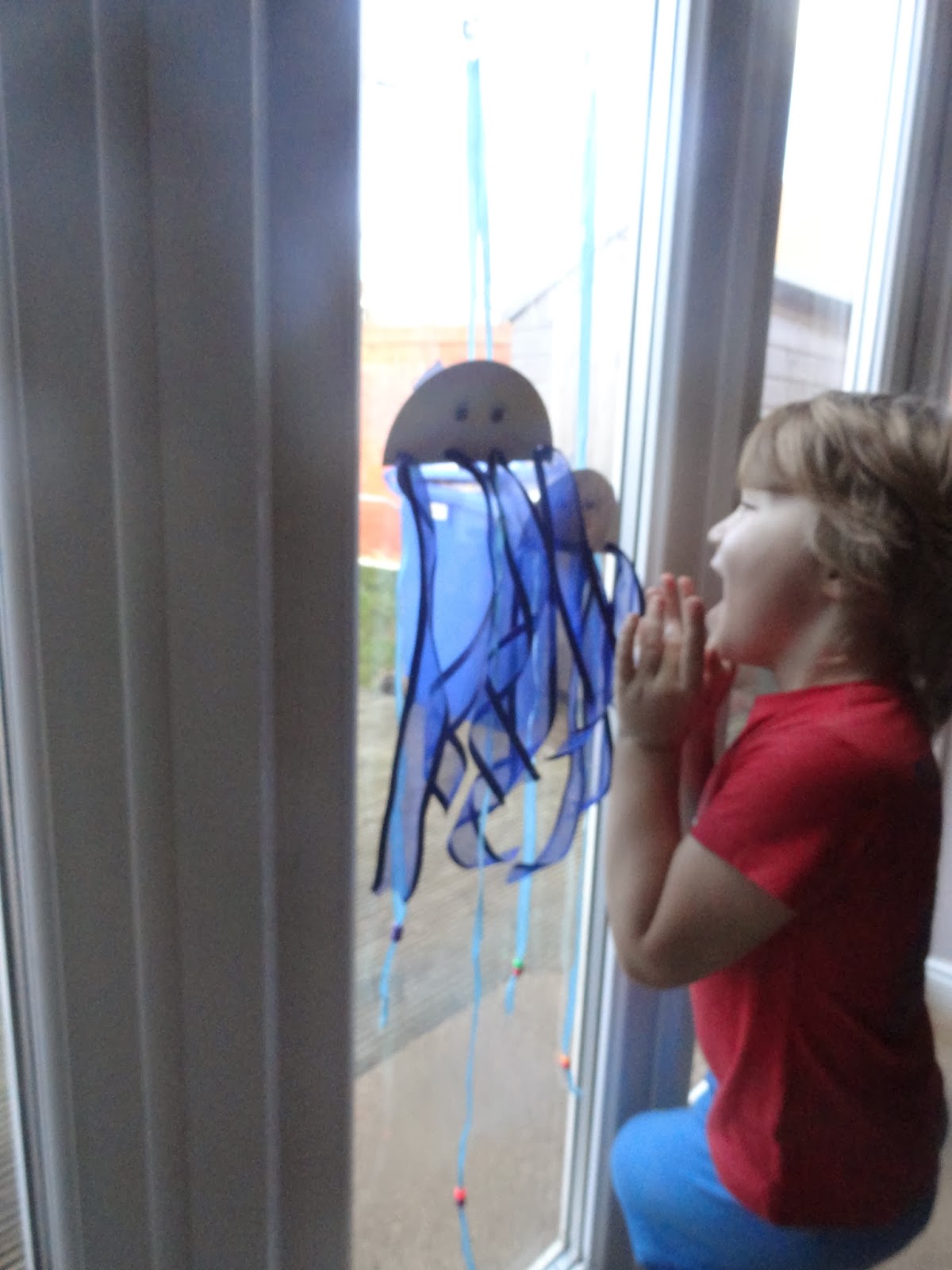 First we made the two Jelly Fish - In the box there was two templates with pre-punched holes, Jacob and I coloured in the templates, stuck the eyes on, and threaded through the ribbons. Also included in the box was suction hooks, so we hung our jelly fish on the back door.