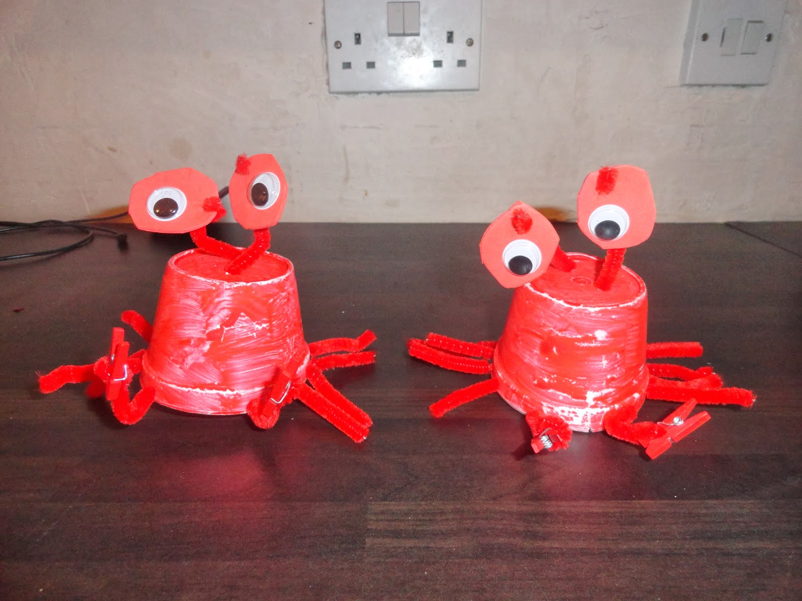 For the crabs, Jacob painted the pots in red, once dried we pushed through the pipe cleaners to make legs, and antennas. We then cut some circles out, stuck the eyes on to each circle, and pushed and secured each eye onto a pipe cleaner. Finally we clipped some tiny pegs on the two front pipe cleaners for the crab's claws.
