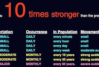The system operates on a base-10 logarithmic scale, measuring the amplitude of seismic waves recorded upon a seismograph. Being logarithmic, each incremental number on the scale denotes a 10x increase in magnitude - that is, a shaker measuring 5.0 on the Richter Scale is ten times larger as one measuring 4.0.