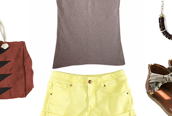 Love Martini V Neck Tee ($25.00), H & M Cuffed Shorts ($17.95), Sabine Tribal Necklace ($30.00), Rocket Dog Shell Sandal ($39.50), House of Harlow Lynn Aviator Sunglasses ($130.00), Billabong Bright Side Tote ($46.00).