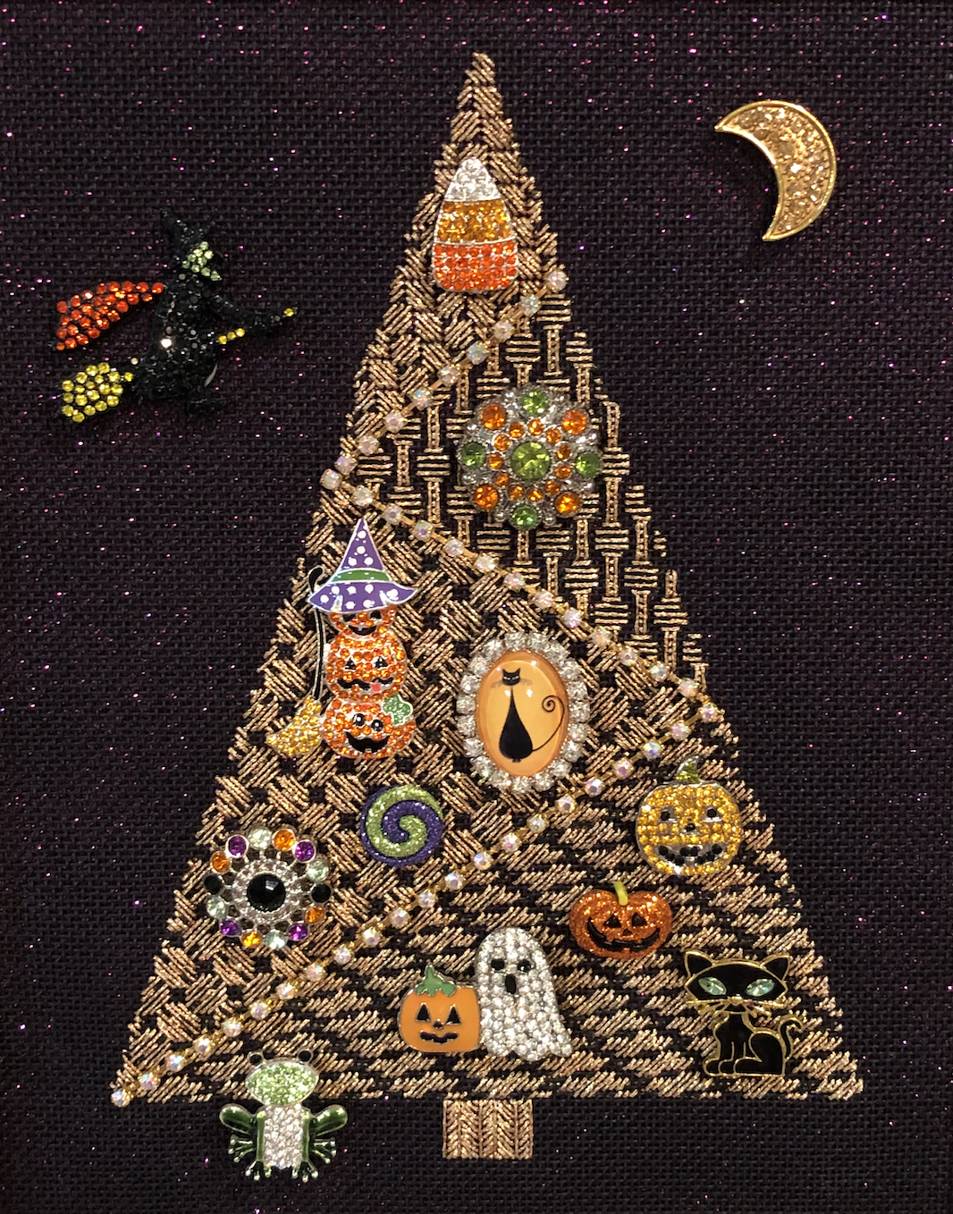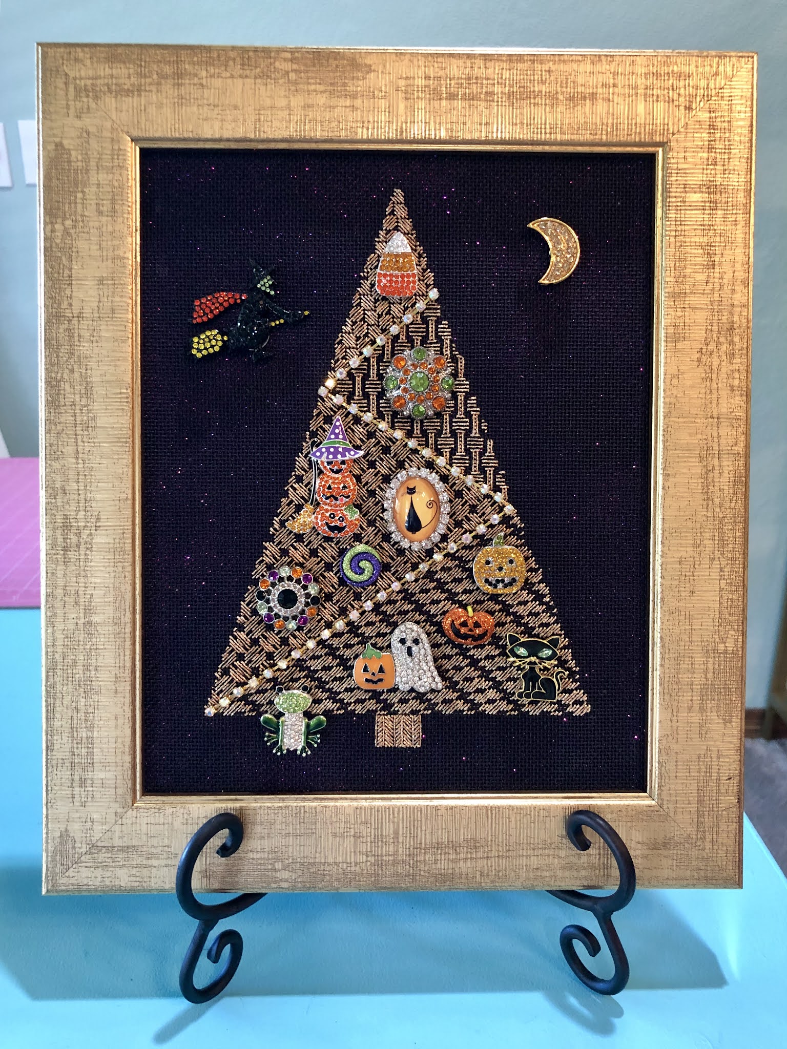 The project is a counted canvas design that you can turn into a display for your magnetic needle minder collection! I have a ton of needle minders and I am always looking for different ways to store, organize and display them. I decided I'd really like to stitch a display and so I came up with this. The idea was inspired by vintage "Jewelry Trees" from the '70's, remember those? They were a great craft project-- you would take all of your old, broken or mismatched rhinestone costume jewelry and glue them down to a velvet background in the shape of a Christmas tree. They were so sparkly and decadent, I just love them! So here is my modern day "jewelry tree." I stitched a tree shape onto black canvas with a gold metallic thread, using my favorite open-type background stitches and trimmed it with a rhinestone chain "garland", then decorated it with my glitziest Halloween needle minders. I placed it in a photo frame, added a glitter paper backing and a thin sheet of tin for the magnets to stick to. After putting the frame backer board in place, I set it up on an easel display. The great thing is that I can easily move the magnets around, and take or add more as I like. I also could easily convert this next month to Thanksgiving/Harvest themed magnets and then Christmas/Holiday in December. I may even stitch another one on a lighter canvas for Spring and Summer themed magnets!
