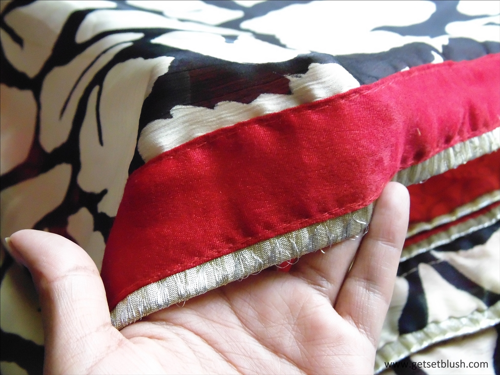 Coming to the saree, I had the privilege to select my saree and I kind of lean towards black most of the times. So this time too, I had to pick a black saree with a very different looking border in beige and it has a maroon color border too. The maroon border is a velvet border with a jari lining which gave the saree a very elegant look. It can be worn for functions and parties. The saree has an attached blouse. The blouse was given totally in contrast with the saree in maroon shade with self design. The whole saree is elegant and stylish. I am yet to wear the saree but I juts tried the day when I got it. The saree is light weight and the material is not thin/transparent. The cloth/material is good for the price we pay and the design is unique and nice. The end jari border seems to be just ok I mean, if you wash a bit hard the jari may go off. It is delicate. As of now, I only see that as a con.