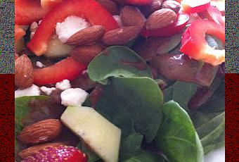 Good Morning! Thursday is my Friday at work(teaching) so it's a good day! When I got home from class yesterday I was VERY hungry. I stopped at the grocery store before coming home and every smell was making my mouth water. Going to the store these days is quite simple because the only area I need to go to is Produce. The idea that healthy folks shop the perimeter of the grocery store is true!! I got home and made myself my favorite salad ~spinach ~red peppers ~cucumbers ~strawberries ~almonds ~feta and ~balsamic vinaigrette... om nom nom!!