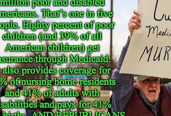 Medicaid is designed specifically to help Americans most in need — who also have the least political clout. The program provides health insurance to more than 72 million poor and disabled Americans. That’s one in five people. Eighty percent of poor children (and 39% of all American children) get insurance through Medicaid. It also provides coverage for 63% of nursing home residents and 41% of adults with disabilities and pays for 41% of all births.