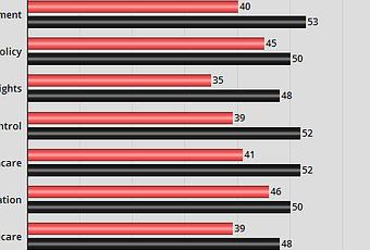 It shows the approval/disapproval of how Donald Trump is handling important issues facing the United States. Note that Trump's numbers are upside-down (more disapproving than approving) on 14 of the 16 issues listed. On terrorism, approval and disapproval are equal at 46%. The only issue Trump has more approval than disapproval on is the economy, where he has a 7 point advantage (50% approving to 43% disapproving).