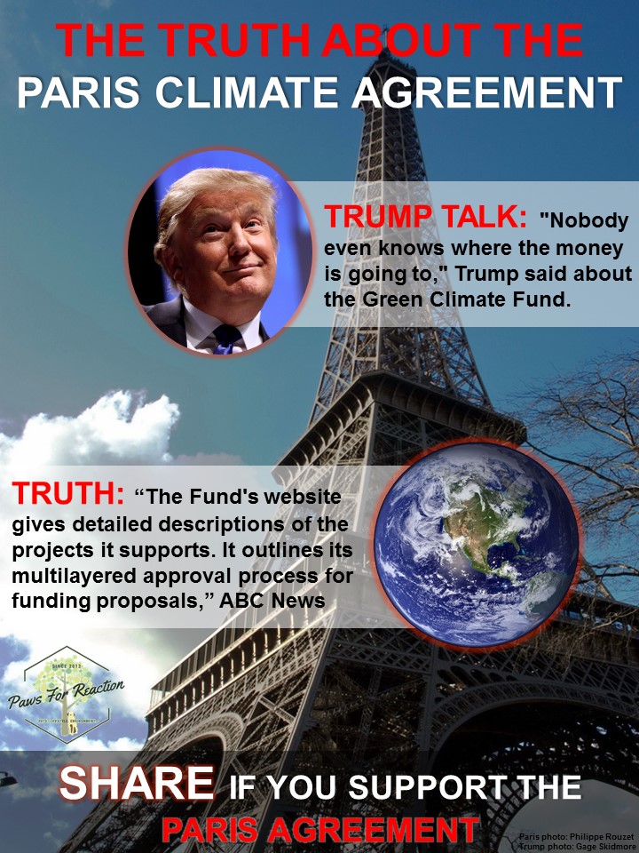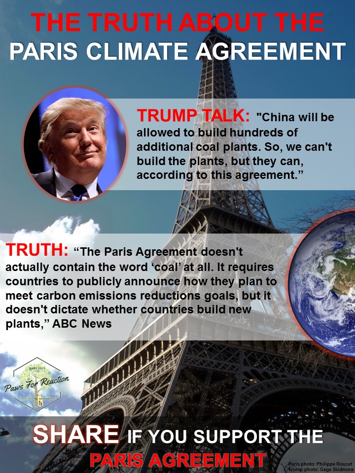 June 4, 2017- This week was devastating to the environment when President Donald Trump announced that he is pulling the United States out of the Paris Climate Accord. In his speech he gave 'alternative facts' about climate science, economics and the details of the Agreement. If one good thing came out of this, it's that so many leaders, businesses and organizations have come together to support the Paris Agreement with more strength and determination that ever before. It's also inspired the first edition of Trump Talk vs Truth- a new Paws For Reaction series.