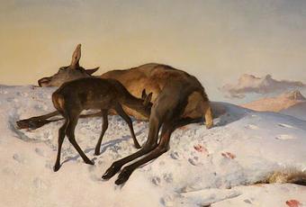 Rats. Well, it's all gone wrong for Bambi, hasn't it? This is all very grim and beautifully painted. Obviously what we have here is a doe who has been killed and her little fawn trying to work out why Mummy is having a prolonged sit-down. To be fair, I often have to have a prolonged sit-down and it's not because I've been callously gunned down in the sparkly snow, but because I've found the M&S food hall particularly gruelling.