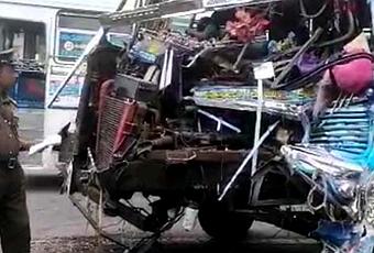 Two people were killed and 16 others were injured in an accident where a bus traveling with a group of pilgrims collided with a container parked on the road at Ambanpola in the Padeniya – Anuradhapura Road at 2.45 a.m. yesterday.